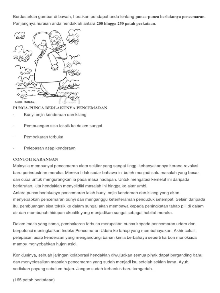 Sungai juga merupakan sumber air dan sumber protein manusia. Contohnya, pelanggaran kapal mv waily dengan kapal mt bunga 3 yang membawa 61 000 lebih tan metrik minyak tanah telah menyebabkan kawasan laut tanjung ayam tercemar teruk. Panjang ringkasan anda hendaklah tidak melebihi 80 patah perkataan. Terdapat beberapa punca yang mengakibatkan pencemaran sungai. Apabila pokok pokok ditebang tanah akan. Kini, banyak punca air kita tercemar sehingga didapati bahawa jika tiada sebarang langkah diambil ia mungkin memudaratkan kehidupan manusia. Sampah organik mereput dan diuraikan oleh bakteria dengan oksigen yang terlarut di dalam air. Tindakan tidak bertanggungjawab penduduk terutama penghuni perumahan setinggan yang membuang sampah sarap telah menyebabkan pencemaran air yang serius. Hal ini berikutan sikap individu dan pemilik kilang yang tidak bertanggungjawab dan peka pada persekitaran sekeliling hasil dari pencemaran alam sekitar yang mereka cipta sendiri. Baca petikan di bawah dengan teliti. Air merupakan keperluan asas manusia. Anda digalakkan menggunakan perkataan anda sendiri tanpa mengubah maksud asal petikan. Punca punca pencemaran air punca utama pencemaran air ialah pembuangan sampah dari kawasan perumahan di sepanjang sungai tepi tasik dan laut.